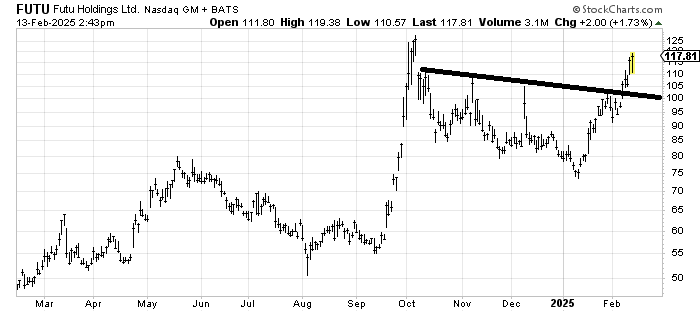 Futu Holdings FUTU broke out but it is in the process of filling that gap from October, which makes it hard for me to get on board. It has a measured target around $135 but I think that high from October is going to be resistance the first time up.