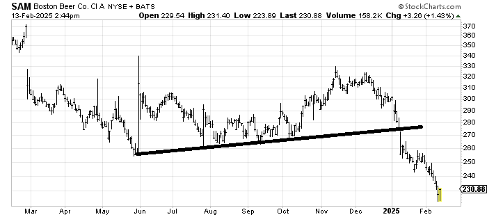 The best news I can offer on Boston Beer SAM is that it met its downside target when it got under $230 this week (target was $220-230). Now it will need to start some up--and-down action before it can show us it is interested in holding. Maybe the price is right but that’s the best I can say now.