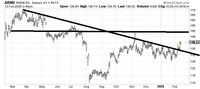 We looked at Airbnb ABNB a few months ago and I sort of liked it because it had that basing look. And then it did absolutely nothing but leak lower and sit there. The fact that it crossed that downtrend line is a plus for me. It has resistance all the way up so there is no clear breakout, but I would say I don’t want to see it back under that downtrend line (which will get further away the further out in time we go so it’s probably not useful). If it can’t get going soon I’d worry.