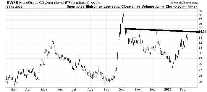 I want to correct something I said the other day when we looked at Alibaba BABA. I made the comment that the other Chinese stocks weren’t acting the same. They aren’t, but I am still of the mind that KraneShares CSI China Internet ETF KWEB ought to get through this resistance but it could use a pullback first. I did not want you to think I was bearish on the Chinese stocks.