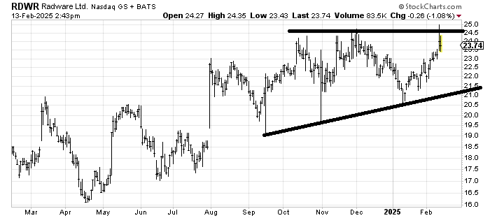 Radware RDWR is so thin and has just run up on a seven-day winning streak. Some consolidation here before a breakout would be helpful but look at all those spikes, that is how thinly it trades.