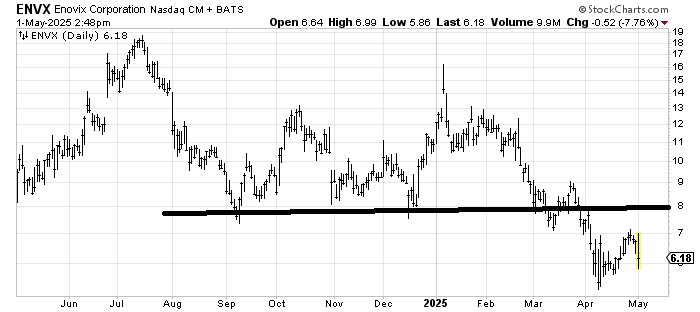 My first thought when looking at the chart of Enovix ENVX is that it has barely rallied from the low, which should be cautionary. Either way, resistance at 8 is quite heavy, and if it stays weak, the measured target is near 3-ish.