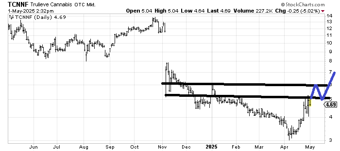Trulieve Cannabis TCNNF has so much resistance between 5 and 6 that if it were to improve, it would have to get up to 6-ish and then have a minor pullback before rallying again. If it did that, I might—might—think it was improving.