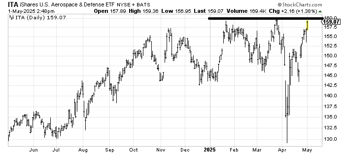 ITA is an ETF to be long Aerospace and Defense stocks. It has already run over 20% from the low and is now knocking on resistance. That’s not my kind of stock to chase. My guess is if it cracks over 160, it would still have a pullback shortly thereafter, having run so far, if it gets over though the measured target would be around 167.