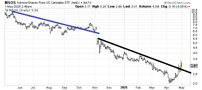 I have been asked about some pot stocks. That means I should preface this by noting I used to hand chart MSOS (the ETF) and Tilray TLRY, and they both fell off the bottom of my chart so often that I finally stopped charting them (by hand). Thus, I am probably biased against them, so understand that when I go through these charts.