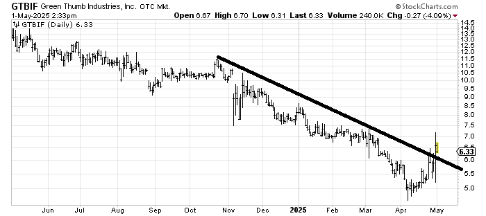 Green Thumb GTBIF had better hold that 5.50 area, or I’d consider the downtrend still intact. Resistance gets awfully heavy at 7-7.50. The stock trades so thinly that it had an outside day yesterday with absolutely no follow-through today.