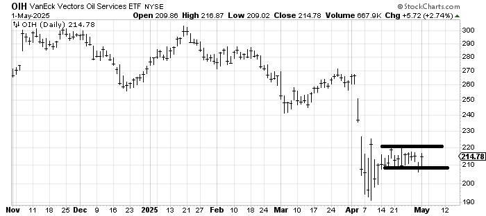 Oil turned around today but I really want for OIH to clear 220. I will use a stop under yesterday’s low. We looked at this two nights ago.
