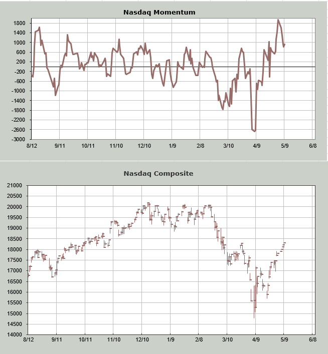 Let me note one more thing regarding sentiment. The VIX has come down quite a bit. It looks a little oversold to me, so I can see it rising next week. But the DSI is back to 29 (recall it was 75 at the lows). If the DSI on the VIX gets to be a teenager by mid-May, that too would be a sign for me.