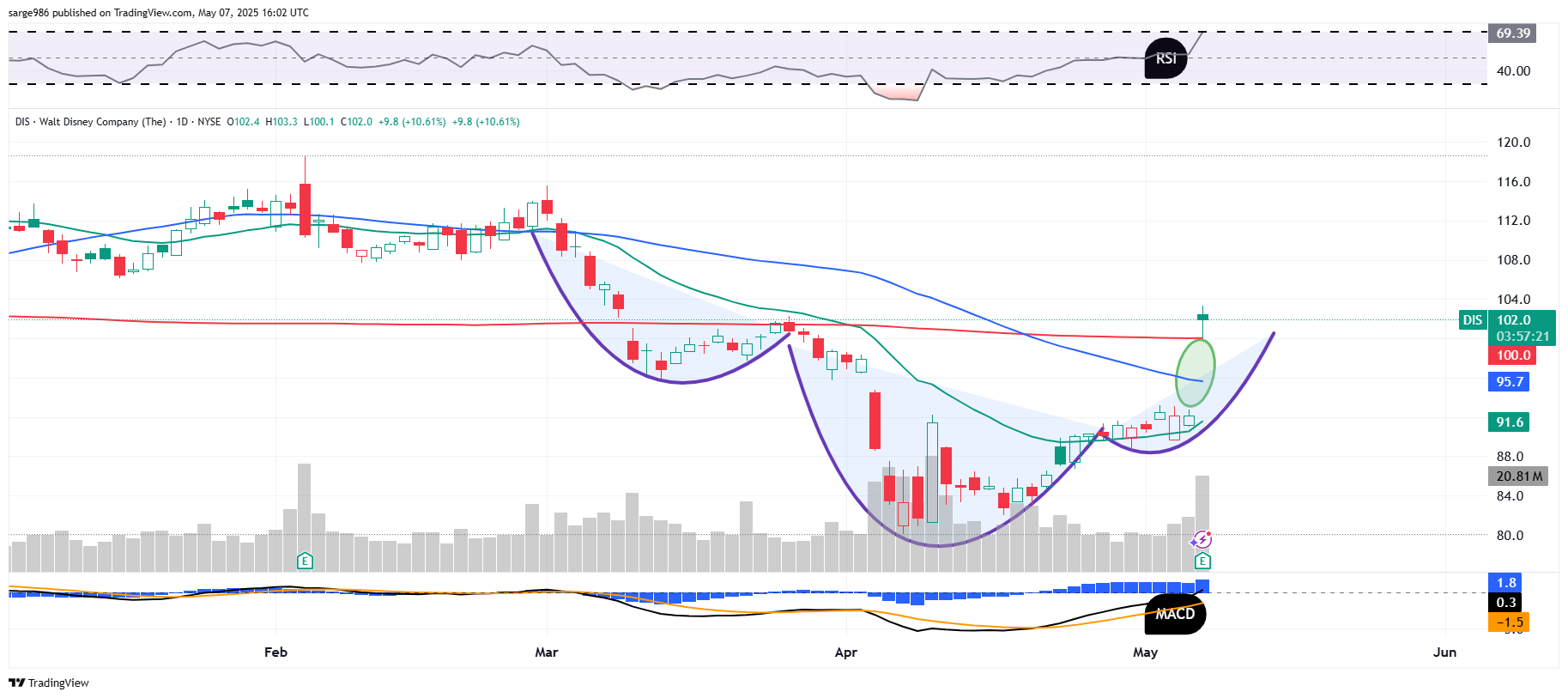 Wednesday morning's gap comes close to completing the head of what was a developing inverse head-and-shoulders pattern. While the stock is struggling on Wednesday morning to create the neckline which would become the pivot, the 200-day SMA has been taken out. If the 200-day line is held, that would force portfolio managers to increase their exposure. That said, it would not surprise to see DIS add a right shoulder to the pattern. That could drive the stock below the 200-day SMA and have it feeling around for the 50-day SMA for support.