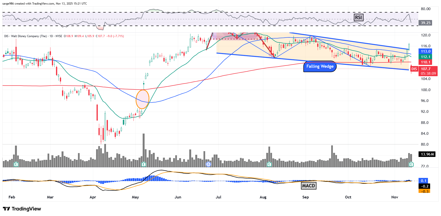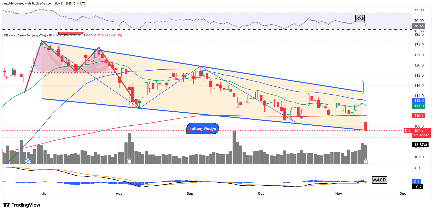 Take a look at this. DIS came off of a double-top pattern of bearish reversal in July ​and proceeded to develop a falling wedge of bullish reversal as the shares sold off over a five-month period. It almost worked. On Wednesday, ahead of earnings DIS tested the upper trendline of that wedge. Thursday morning? The stock has surrendered its 50-day SMA (losing some portfolio managers), its 21-day EMA (losing the swing crowd) and its 200-day SMA (losing seriously die-hard portfolio managers).