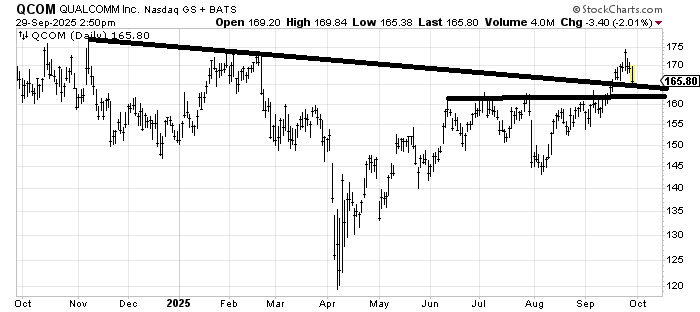 Qualcomm (QCOM) did end up stopping right at resistance last week (175). I think it holds that 160 support area on this trip down and rallies again. But if it can’t get over 175 on the next trip up, I would fret that it’s like last October or February (see both of those double tops?).