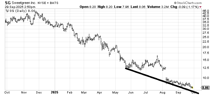 The only reason I can think of Sweetgreen (SG) rallying is that it bounces off that line and is oversold enough as we enter the fourth quarter. Otherwise, I see no pattern that says buy me. Also this is a candidate for tax loss selling.