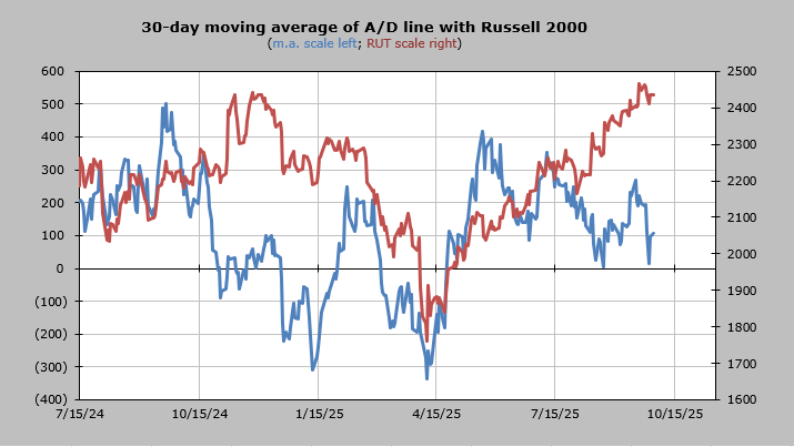 The 30-day moving average of the advance/decline line isn’t overbought, and it isn’t oversold. A decline in the market in the next few weeks would lead it to an oversold condition because it is already so close to the zero line.
