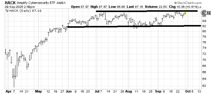Folks seem quite intent on getting exposure to Cybersecurity, as I was asked to look at HACK, an ETF to be long this group. Typically, I would say sure, why not, it ought to get up and over that resistance line, but in this particular case, I think I would wait for the line to be crossed (88), and if you want to get in now, just use a stop under 85.