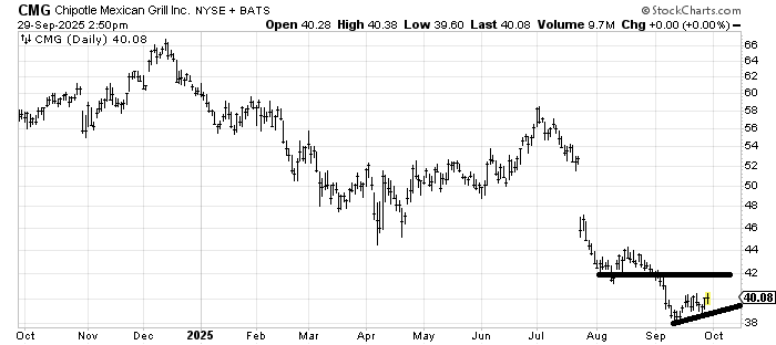 Chipotle Mexican Grill (CMG) is trying to bounce off that measured target at 40 but that’s the best I see for now. A rally to 42-44 would probably be what stops it the first time up.