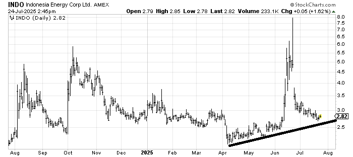Oftentimes stocks that surge and give much of it back need a long time to rebuild. Indonesia Energy INDO had a big spurt in October last year, gave it up and then spent the next nine months chugging along. I don’t know how long it will take INDO to rebuild but the action looks similar.