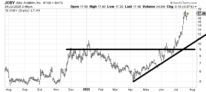 From my vantage point I would call Joby Aviation JOBY a hold because it hasn’t done anything wrong yet, but I cannot buy a stock that has gone parabolic like this one has (doubling in the last three weeks). It seems vulnerable to a correction.