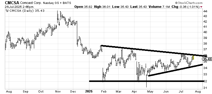Comcast CMCSA is an interesting chart because it hasn’t gone anywhere all year. It’s been making higher lows since May but no higher highs. Crossing $36-ish would change that. I am positively disposed on this one although they tell me cable TV is dead!