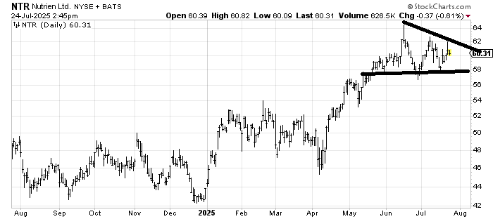 In the near term I think Nutrien Ltd. NTR is a coin flip. You can see the triangle pattern on the one-year chart. You might recall I have liked this chart for quite some time with that big base. The initial target was around $62-ish.