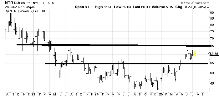 But look at the NTR three-year weekly chart. While there is resistance all the way up, that is a base, so as long as the stock doesn’t crack much under $55 I am willing to wait while it continues to develop and then hopefully get up and over $65.