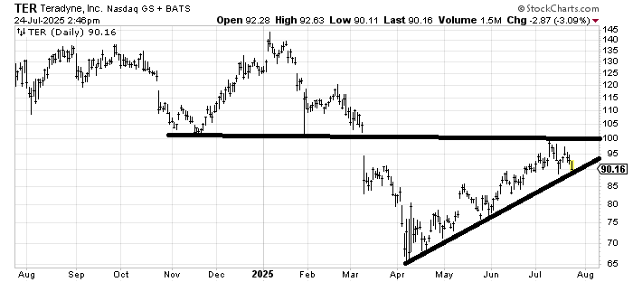 I don’t love the chart of Teredyne TER because it had a hard time filling that gap from March and then gave it up immediately. The chart says this is where you buy it (at the uptrend line) but I think this line breaks and the chart does a bit more work down here. If it breaks and holds $85 I might get interested again so ping me if it does that.