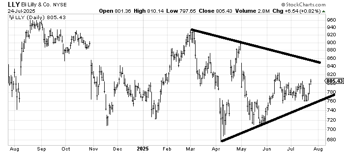 I don’t have a short-term view on the stock being that there is resistance just overhead at $820, but the chart has formed a big triangle in 2025 so I like LLY as long as it stays over $760-ish. It feels as if it is trying to base. Earnings are out August 7.