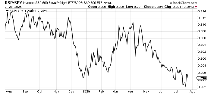 The SOX was up Thursday but not as much as the Nasdaq so here, too, that ratio heads down. And remember the excitement over the Invesco S&P 500 Equal Weight ETF RSP? Well, that did poorly vs. the S&P so once again, that is looking like a one-day wonder.