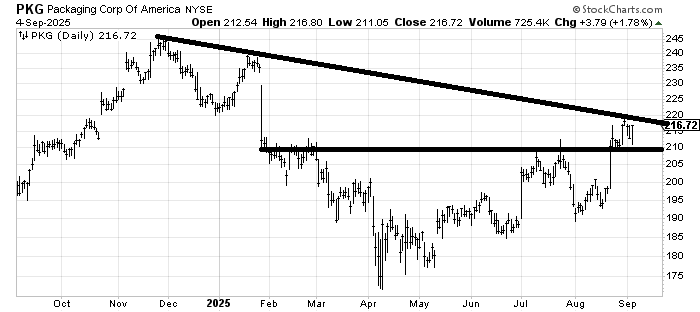 Packaging Corp of America PKG broke out a few weeks ago, came down, and retested the breakout. Now, if it can get up and over 220, that would be a good thing.
