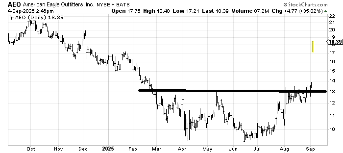 I think I liked American Eagle Outfitters AEO the last time we looked at it because of that base. Now with the gap on earnings, it seems to finally be filling the gap down from last December (19-20), so I would not chase. If pullbacks can hold 17-ish in the next week or so, I might be willing to be a buyer again.