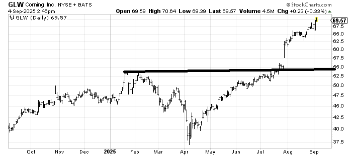 Corning GLW, which, if you don’t know, gets its ticker from the name it used to have, Corning Glassworks, has had quite a run. It hasn’t done a thing wrong, but it is at a measured target. If I owned it, I would probably take a few profits, but aside from that, it would need a lower high and a lower low to turn this into a negative chart.