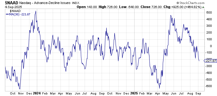 I would love to see a whack in the market, so if the Jobs report tomorrow or the PPI next week does it, great. The reason is because the 30-day moving average of the advance/decline line for Nasdaq is getting oversold. Typically, when it gets into that -300 area, the market bounces.