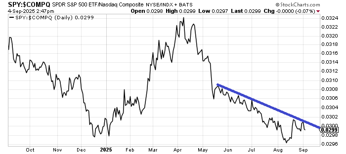 I was asked to follow up on the ratio of SPY to Nasdaq, and I must report that it still has not crossed that downtrend line. Unless/until it does, then we can only watch for a trend change, because it is not with us yet.