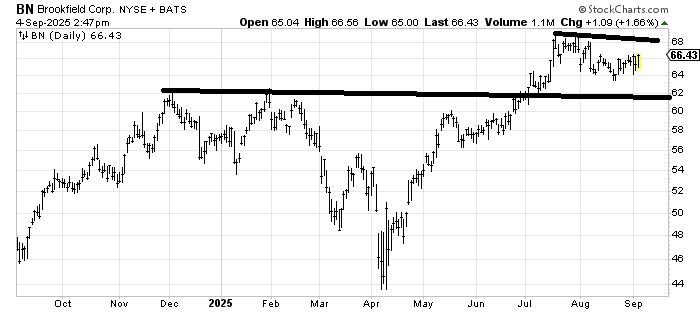 Brookfield Corp. (BN) has an unfulfilled target in the upper 70s, so as long as it doesn’t crack under 62 with any vigor, the last eight weeks look like a correction. I would get concerned if it cannot push through 68-69 on this next push upward.
