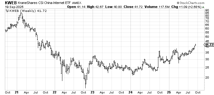 I have been a fan of KWEB for a while (see my BIDU recommendation a few weeks ago), mostly because of this very long base we see. This is a five-year weekly chart. In the near term, there is resistance not far overhead at just shy of 45. A correction back into the upper 30s would be helpful, or even some sideways action. Remember, this is a weekly chart, so it takes much longer for it to play out. I think it does eventually get over that mid-40s resistance, but it’s hard to chase it for me right now.