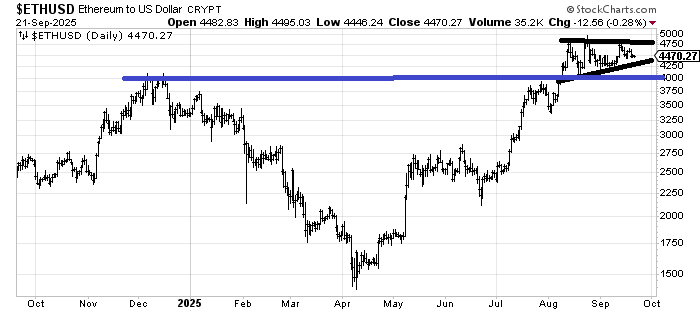I feel as though I need to preface my comments on anything crypto by saying I see them only as trading vehicles, so it is hard for me to get behind. When it comes to Ethereum, this looks like a flag, and as long as it stays over 4000, that’s what I would consider it. So, it really needs to get up and over 4750 to do another leg higher.