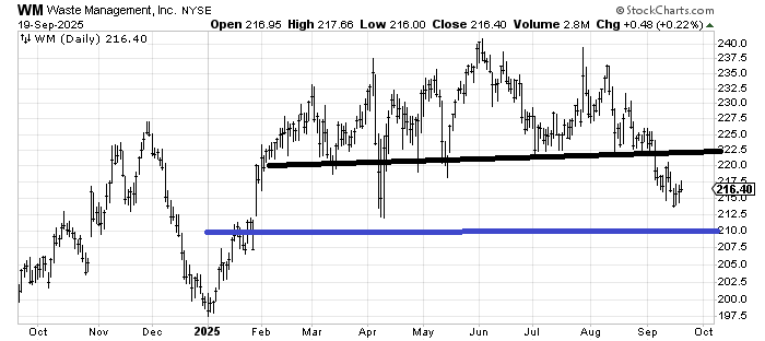 Waste Management WM has broken down from a top, but curiously, as large as that top is, it only measures into that 210-ish area, so I would love to see a whoosh down into that 210-212 area. It might turn out to be a good year-end stock.