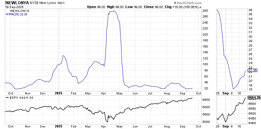 On Friday, the NYSE saw 49 stocks making new lows, which you can see is the most since early August when the S&P nearly two hundred points lower. And what’s more: that’s double what the reading was on Wednesday! Down below, you can see that the 20-day moving average of new lows has been rising for the last two weeks, yet the S&P is up 250 points in that same time.