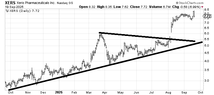 Xeris Pharmaceuticals XERS had a measured target around 8, and it has achieved it. Now it would be good if it can develop another pattern. If it slips much under 7, I think the pull toward closing the gap just under 6 gets greater so ideally it will need to just churn up here because right now it looks to me like it’s gone too far and is over-extended.