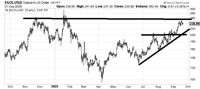 Solana has not even made it over the 2025 high yet and looks to me as if it would like to test support back near 200, or even the line near 220.