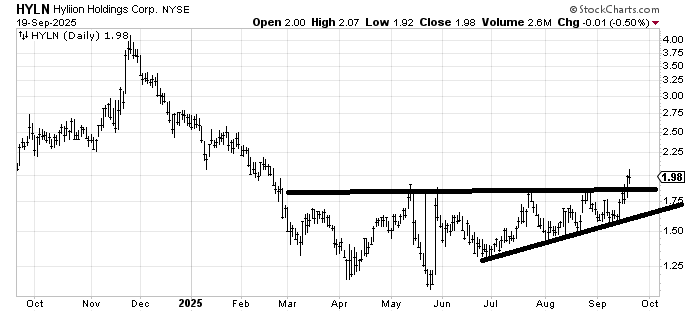 Hylion (HYLN) is a developing base, so I like it. The numbers are so small because it is a one-dollar stock, that I can’t really give a target. I would say that you don’t want to see it back under 1.50.