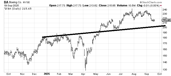 I had a measured target of 248-250 on Boeing BA, and it pretty much achieved that in July. I have been waiting for it to revisit that line, which is 202 currently but rising as time goes on, and it has so far refused to do so. So I would take another look at it down there.