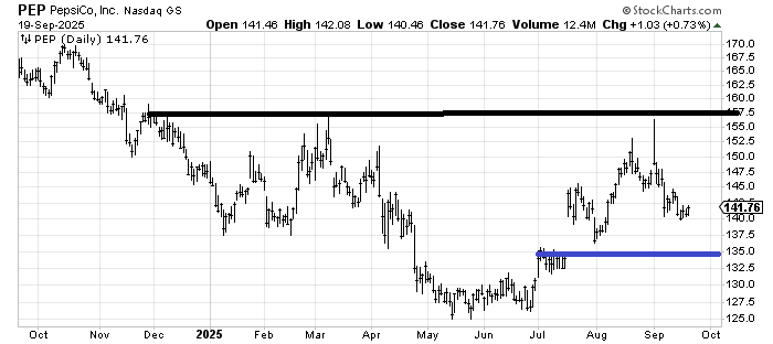 We looked at Pepsi PEP in the Feedback section about a week ago, and yet the questions keep pouring in. I think Pepsi is making a bottom, let’s call it a potential head and shoulders bottom. My only question is if it needs one more whack into that 135-137 area. Somewhere in this area, it looks okay to me.