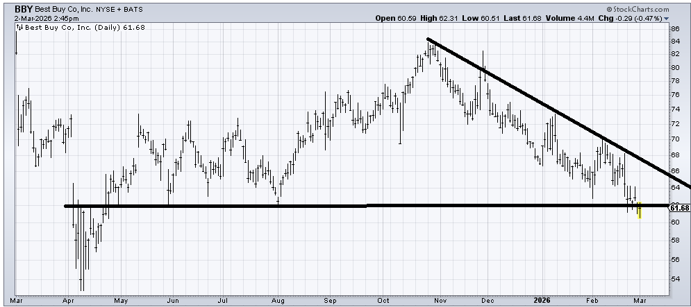We can add Best Buy (BBY) to the list of stocks that have revisited the area of the Tariff Tantrum lows. I think it is oversold enough to rally from here. However, I think I am going to need to see more signs of holding and basing before I find comfort in the chart again.