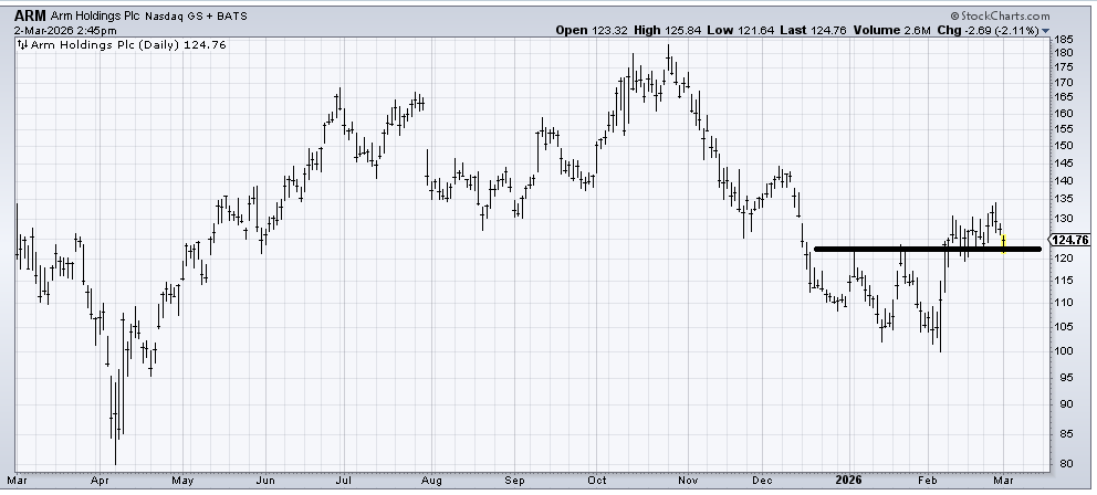 I still think Arm Holdings (ARM) is okay as long as it holds over this 120 area. If it can hold over it and rally again, then I think that little gap fill around 140 is still in play.