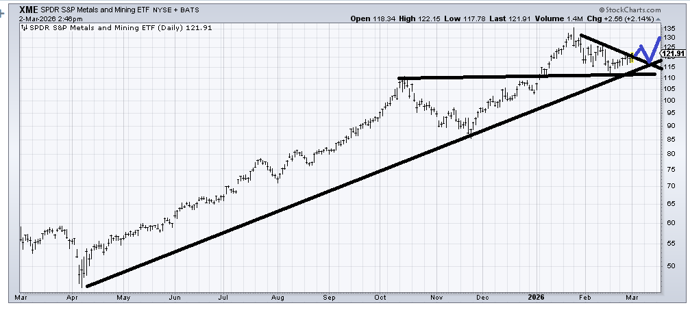 I remain positive on the chart of (XME) as long as it doesn’t break 110. But it really needs to rally with more oomph because right now it’s creeping upward, without much life. I would like to see it map out as I have drawn in blue.