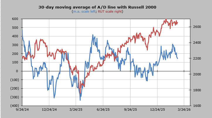 The 30-day moving average of the advance/decline line is not yet oversold. I expect we will see it rise for a day or so and then back down again.