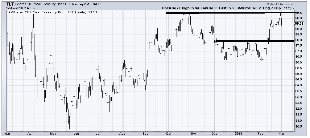 I was bullish on (TLT) a few weeks ago, but now I am not. I am not bearish; I just don’t want to buy TLT up here. My view remains that TLT (bonds) is mostly in a wide trading range, and each time we get near the top of the range, we should look to sell, and near the bottom, we should look to buy. At some point, that view will change because the chart will change. I suspect if TLT drops back anywhere near that 88 level, I will warm up to it again. For now, I am simply neutral.