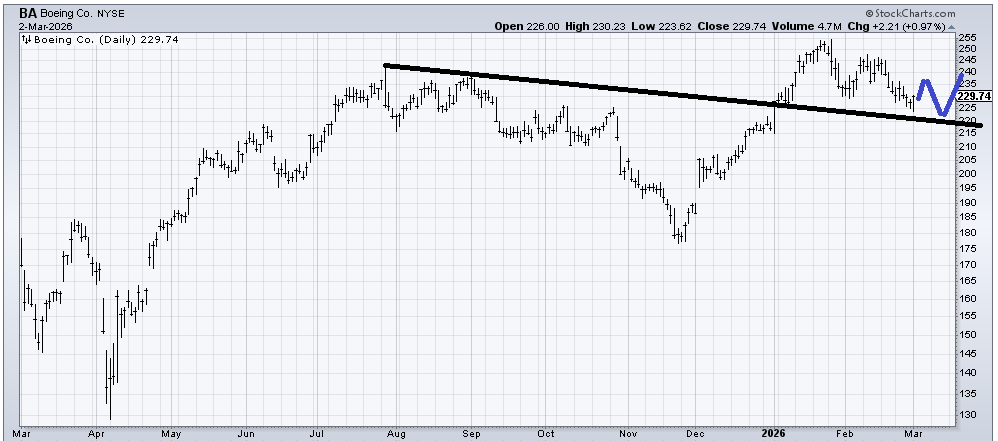 For months now, I have been asked on a regular basis about Boeing (BA) . My view has been that I wanted to buy it on a pullback. It is finally pulling back (down about ten percent). I’d love it to rally a bit, come down one more time, and then go (drawn in blue). But for those who have been waiting, we’re getting there.