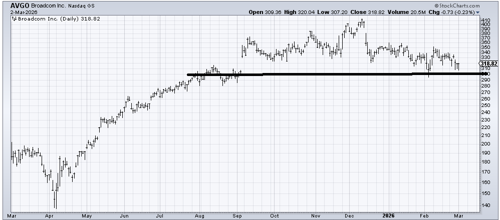 But now I want you to look at three well-followed semi stocks. One of them has earnings this week, Broadcom (AVGO) . I typically wouldn’t comment on a stock with earnings, but here too, my view hasn’t changed: break 300, and there’s a problem. Hold 300, and it’s still just a giant sideways.