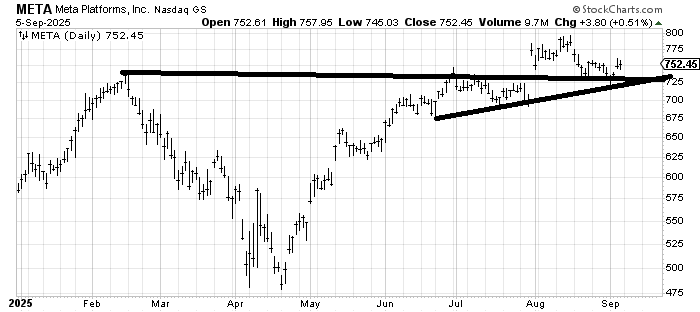 Meta META hasn’t done anything wrong yet. It broke out, had very little follow-through, and then tested the breakout. So as long as it stays over 725-ish, the chart is fine.